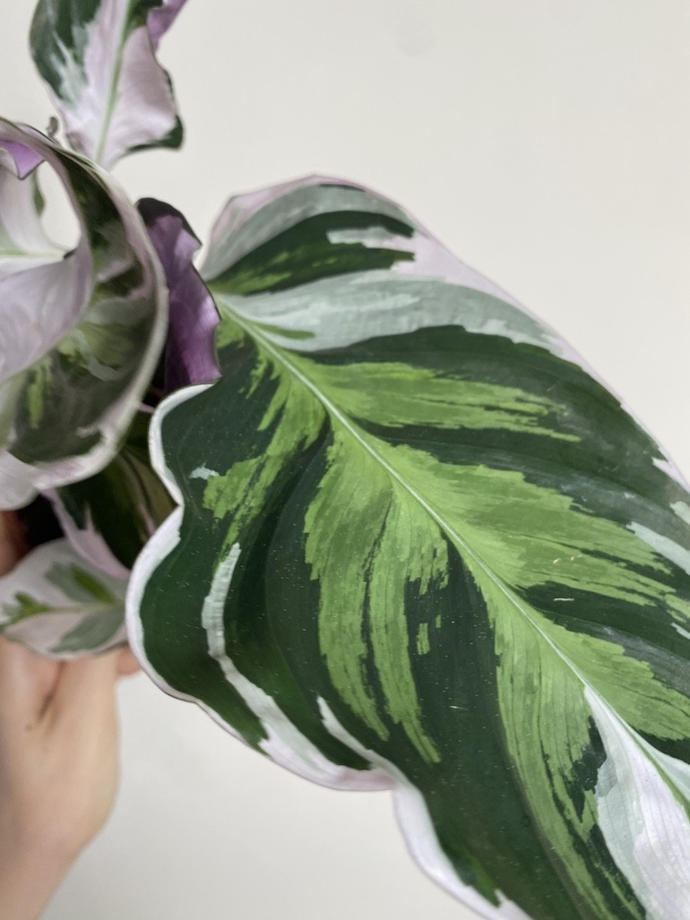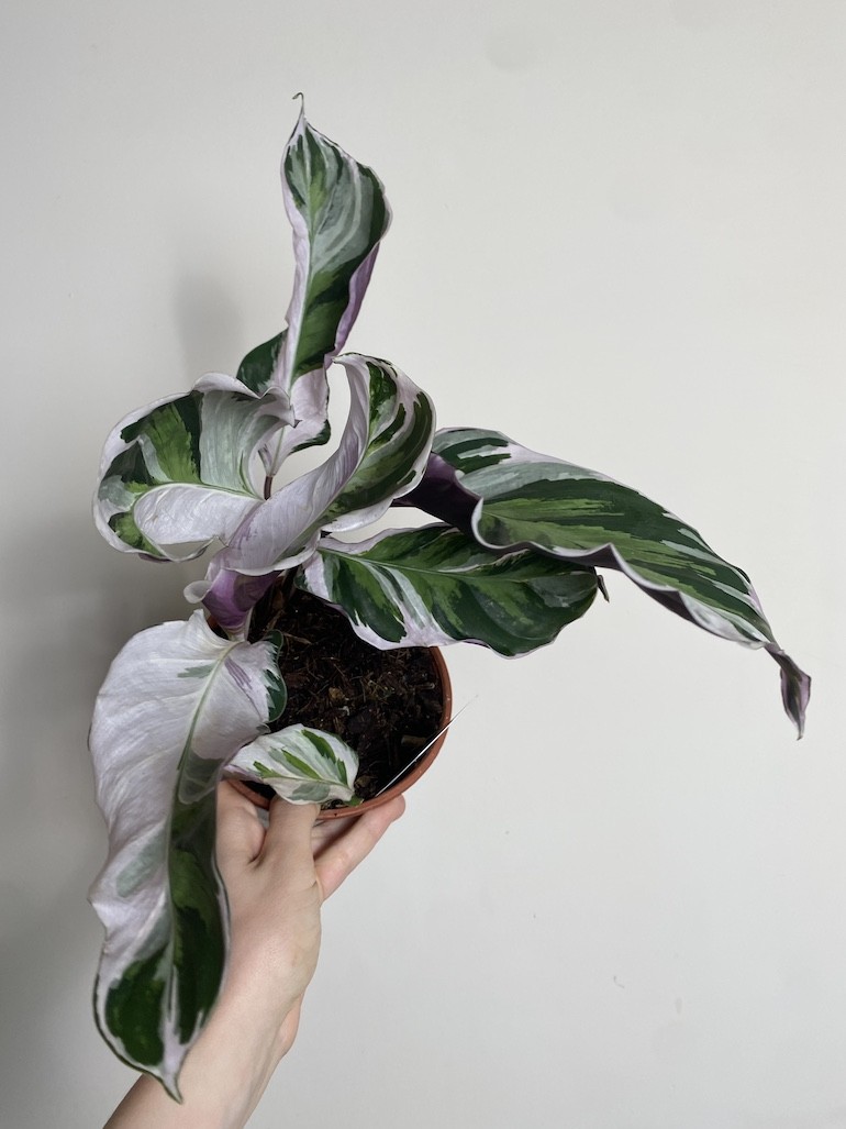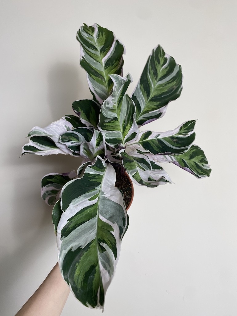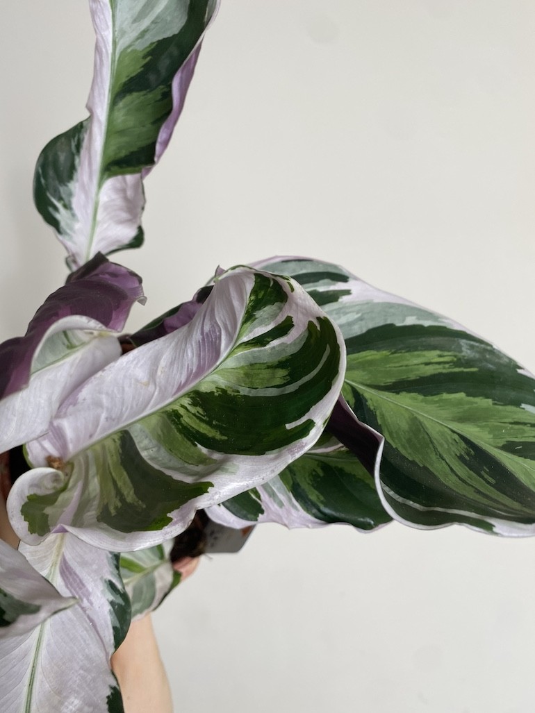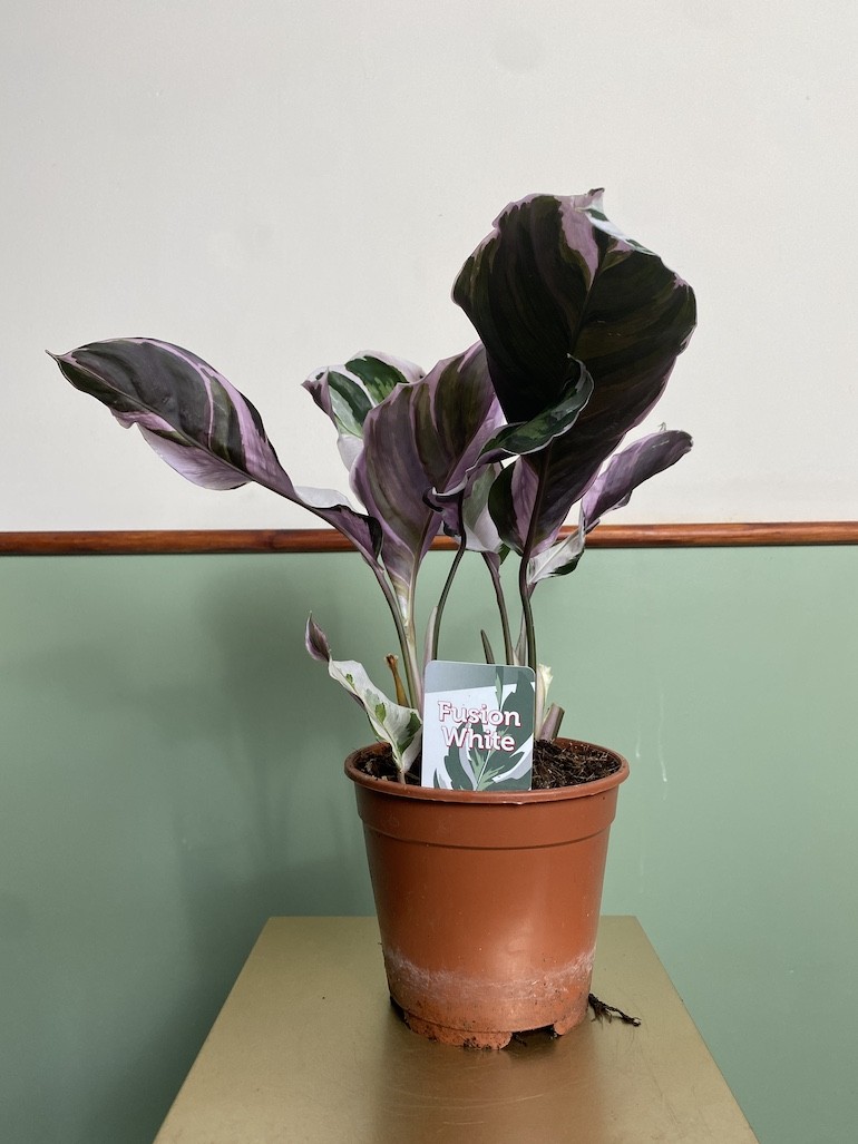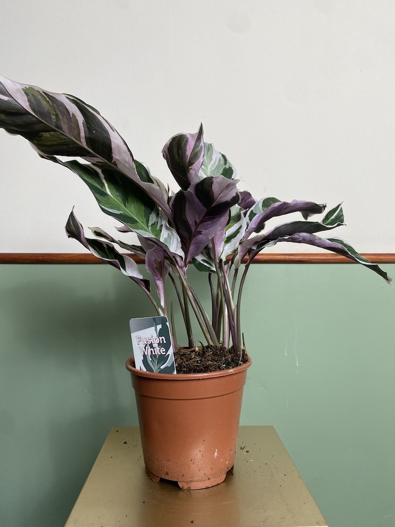 Calathea ‘Fusion White’ to rośliną rzadko spotykaną w sprzedaży, ciesząca się dużym uznaniem wśród miłośników kolekcjonerskich okazów. Jej niesamowite ulistnienie jest koloru jasnej zieleni z widocznymi białymi przebarwieniami.
